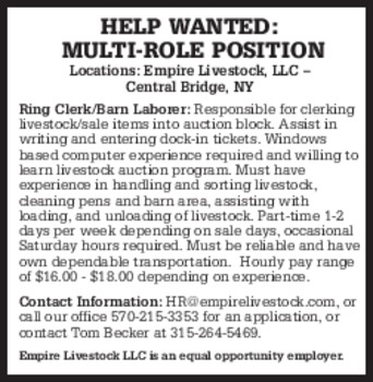 Part time , possible full time. Wage dependent on experience but no experience necessary. Will train. Please call 607-967-5627 if interested